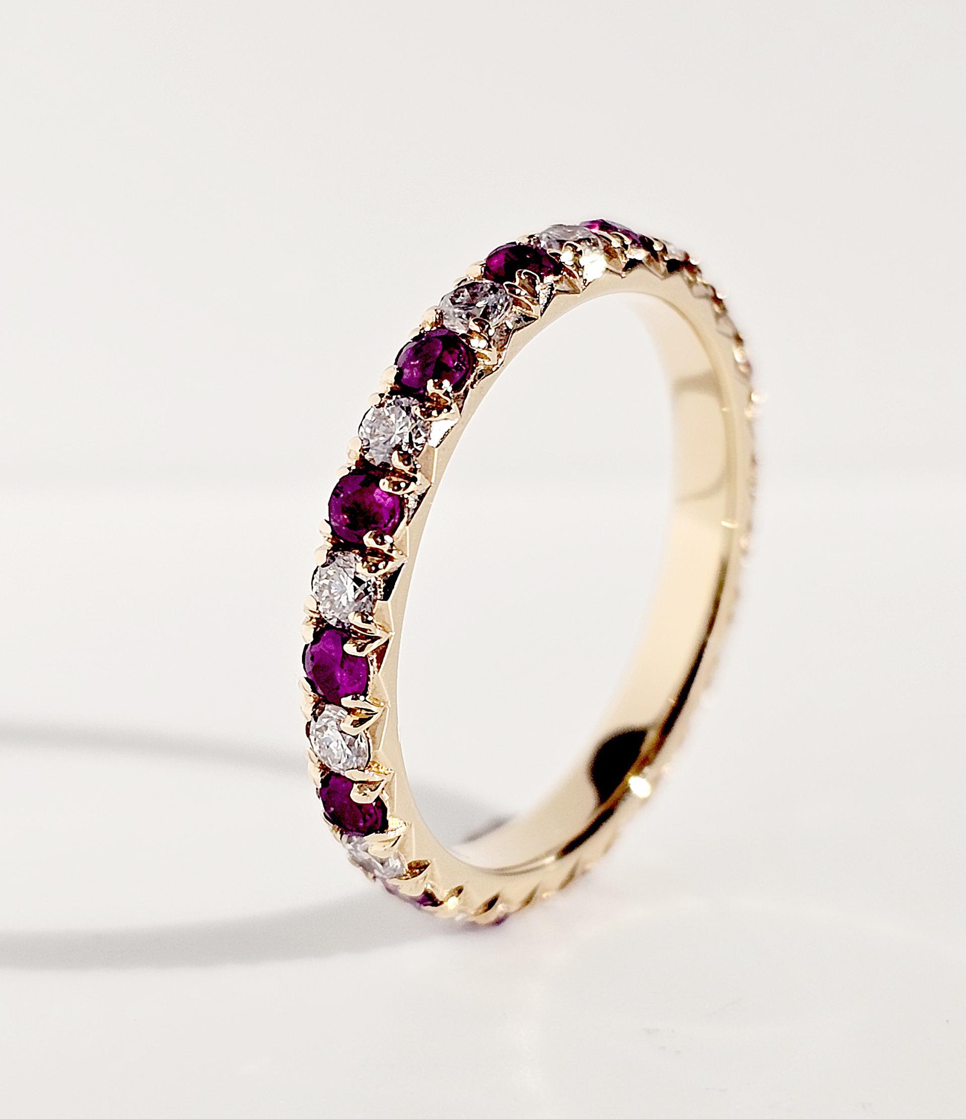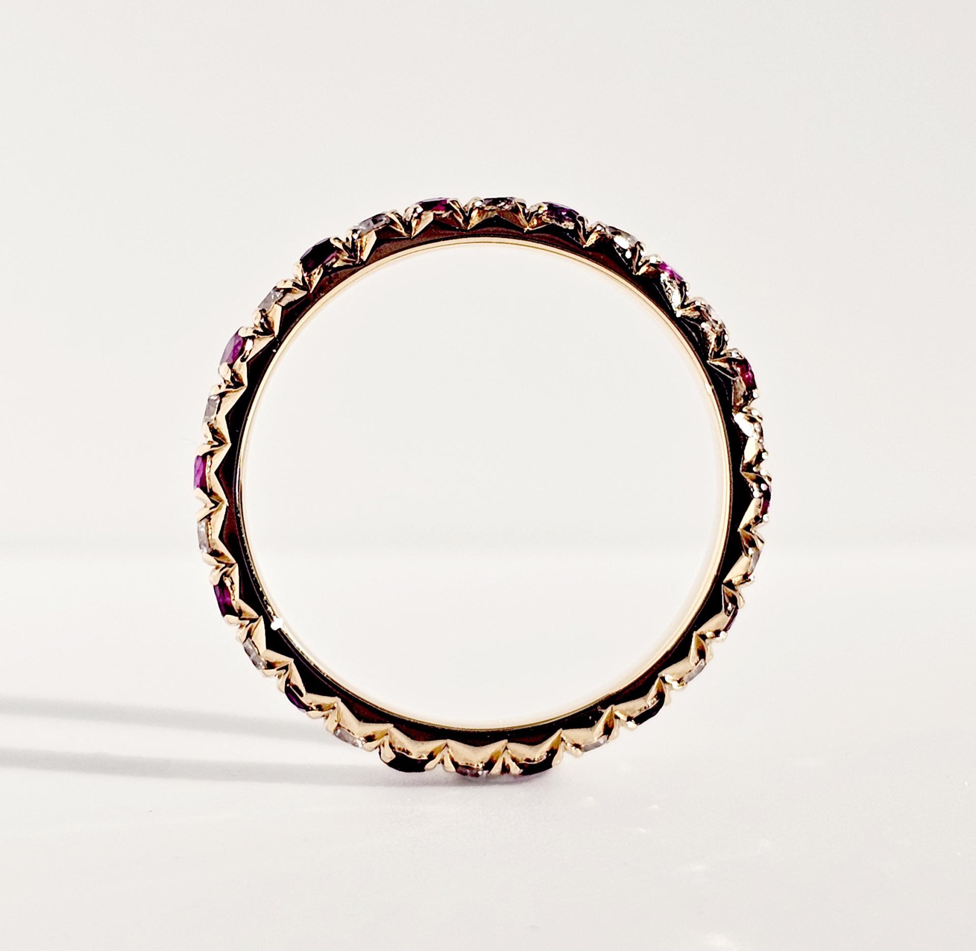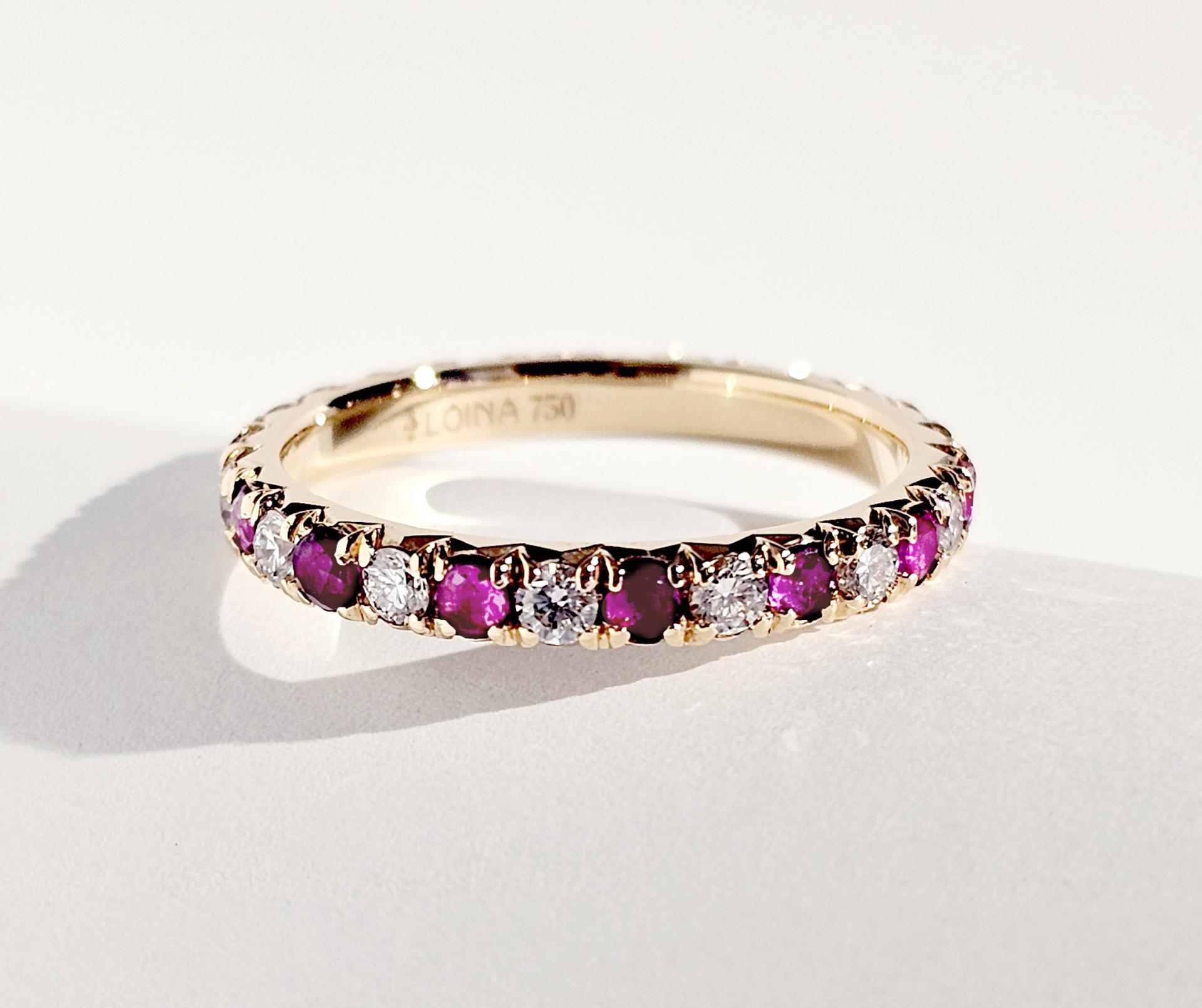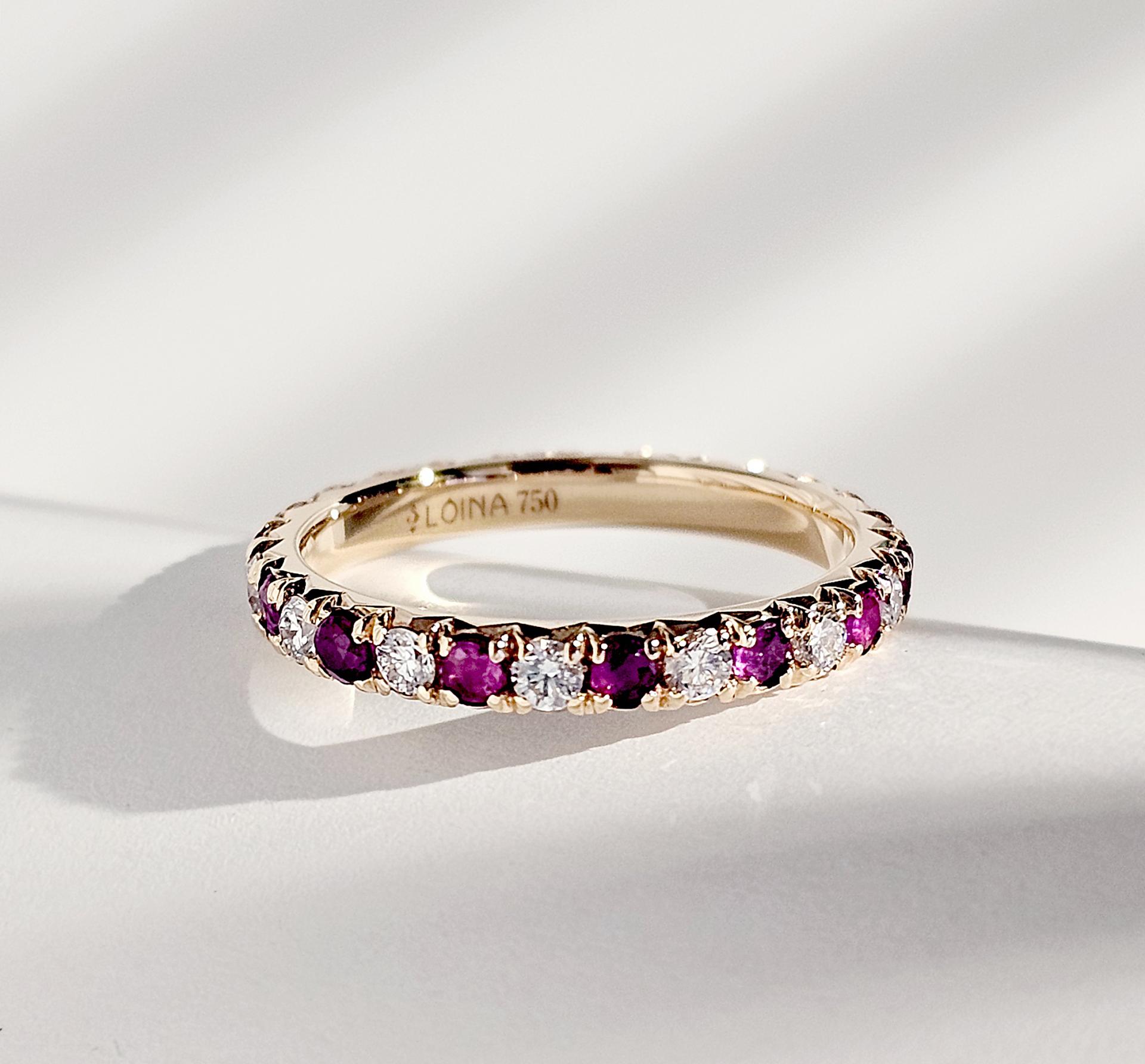 따뜻한 골드 위에 흐트러짐 없이 놓인 루비와 다이아몬드.
